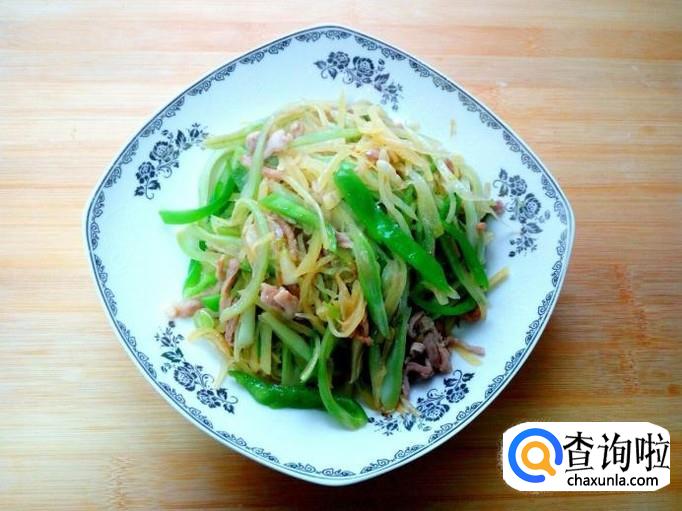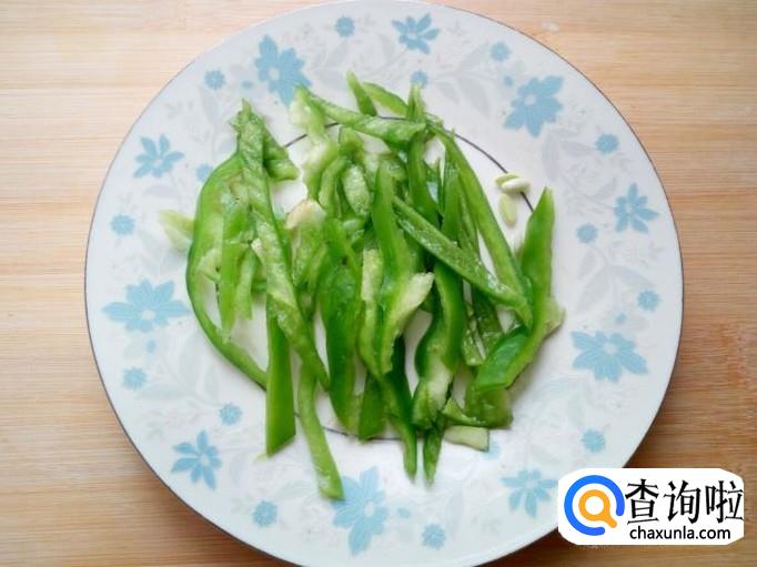 青椒用水清洗干净,控干水分,切成丝。
