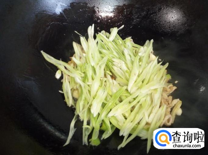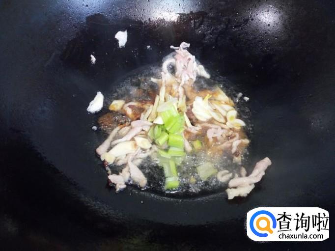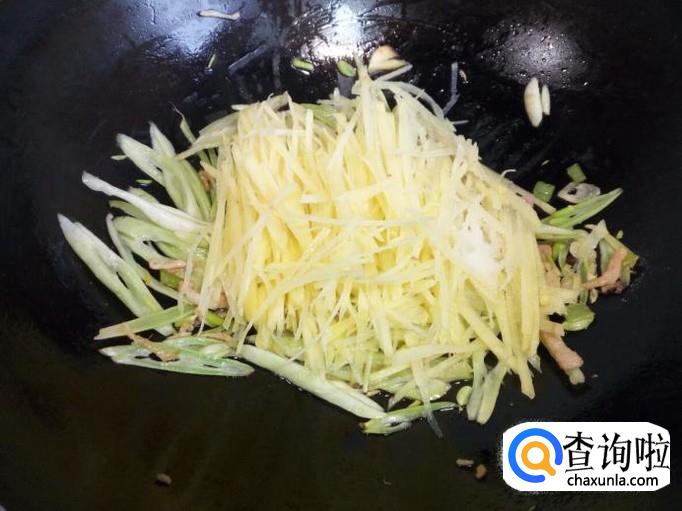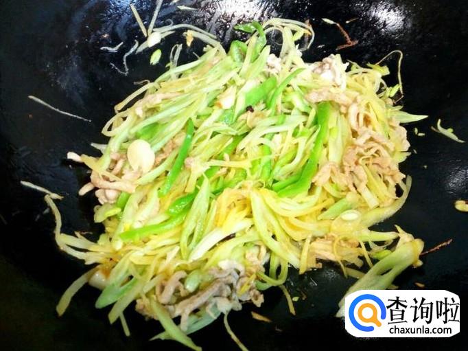 炒至肉丝颜色微白,放入料酒,酱油,葱,姜,蒜,翻炒。随即放入芸豆丝翻炒。