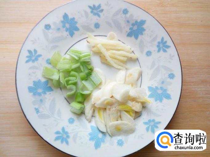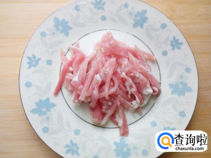 猪肉用水冲洗干净,控干水分,切成丝。切好葱,姜,蒜,备用。