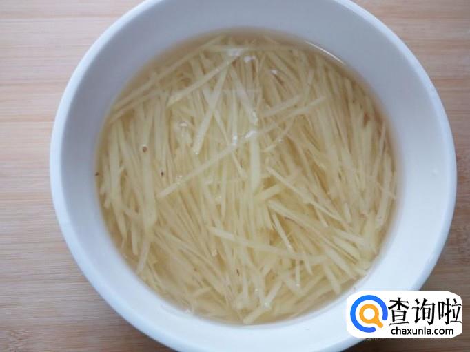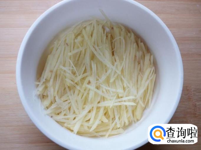 土豆去皮,用水清洗干净,控干水分,切成丝。放入水中浸泡一下,去除上面的淀粉成分,然后用水投洗干净,控干水分。