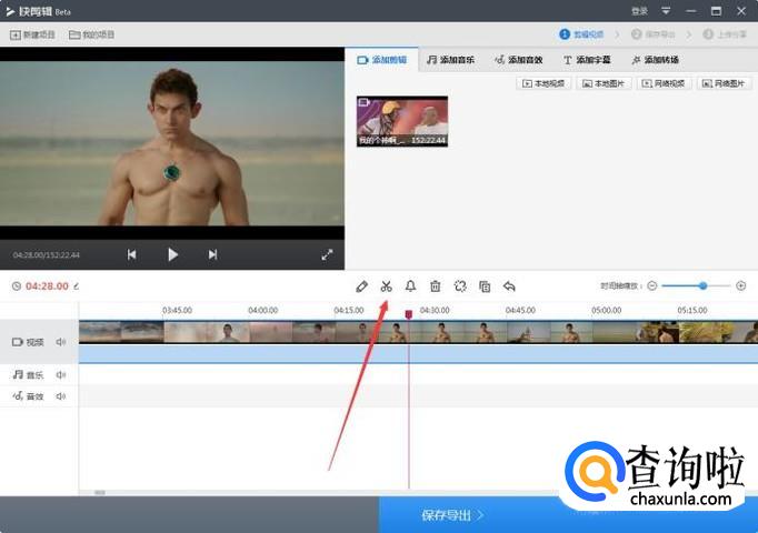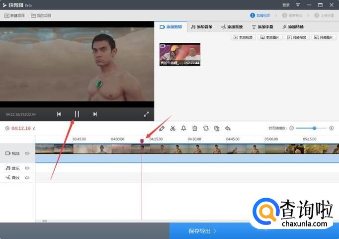 电影导入后会自动添加到软件下面的时间轴上,点击播放、或者拖动进度条,找到自己想截取的片段,点击暂停播放。