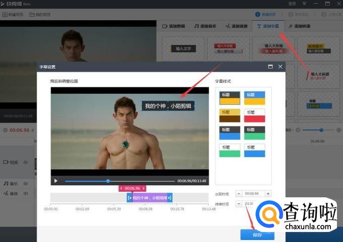 弄好以后点击完成,点击添加字幕,可以给你剪辑的电影片段添加自己需要的字幕和标题如图所示。