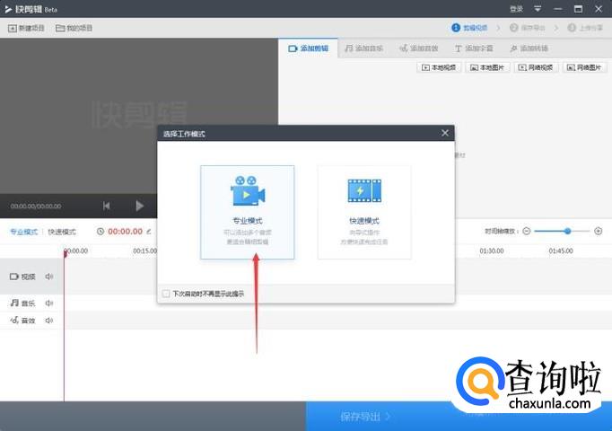 先下载一个快剪辑,安装好以后,在电脑上打开快剪辑,点击右上角的新建视频,选择专业模式。