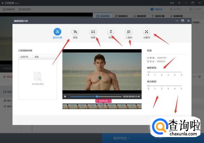 接下来我们可以选中剪辑的电影片段,点击上面的小笔,可以进入视频编辑界面,在这里可以给电影片段进行:美化、贴图、去水印等操作。