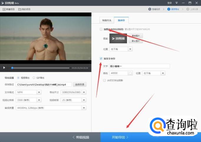 都弄好以后,点击下面的保存导出,即可保存当前剪辑的电影片段了,在水印那把软件水印去掉(也可以添加自己的水印),在左侧设置好保存格式和位置,点击开始导出即可。