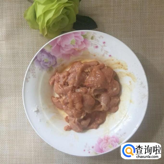 然后把瘦肉切成薄片并用适量的地瓜粉和酱油裹一下,如下图所示。