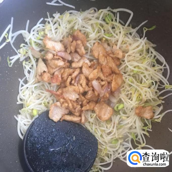 然后把刚才炒好的瘦肉倒入锅中和豆芽一起翻炒两分钟,如下图所示。