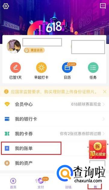 登录京东金融APP后,在下方的菜单栏中,点击“我”进入个人主页,点击“我的账单”选项。