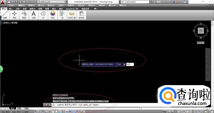 命令窗口显示"LIMITS 指定右上角点",如图所示。输入右上角坐标"594,420",按回车键确认。