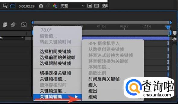 接着添加关键帧辅助,点选全部关键帧,右键点击关键帧,选择“关键帧辅助-缓动”