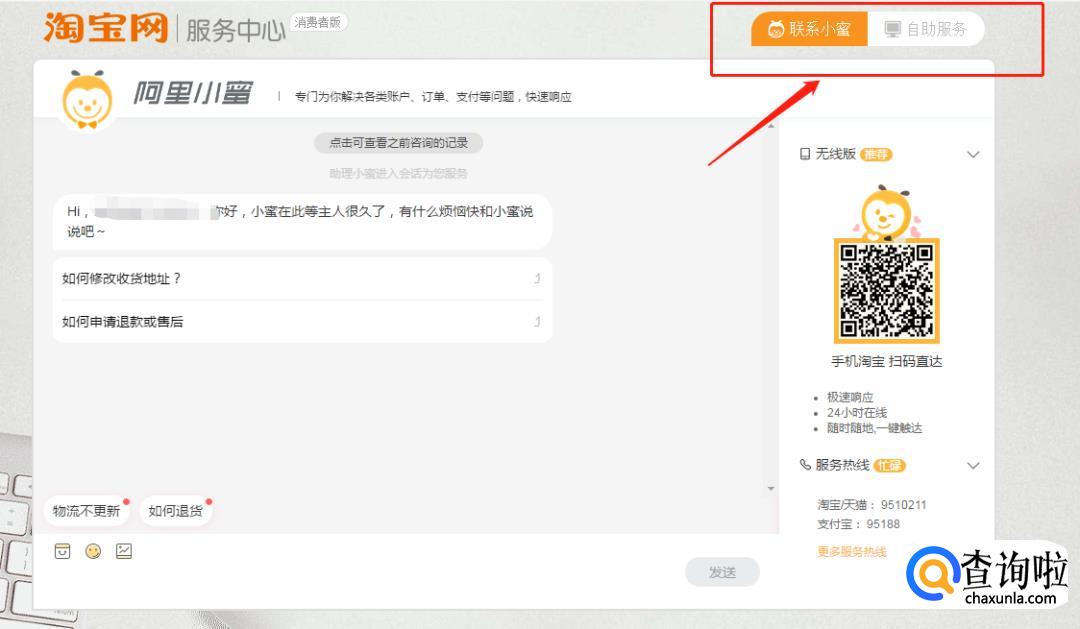 点击后会弹出下图窗口,在窗口右上角有“联系小蜜”和“自助服务”两个选项,如图打开的是“联系小蜜”窗口,你只需要根据问题情况进行点击操作,查看相应的疑问,就可以对应找到解决办法。