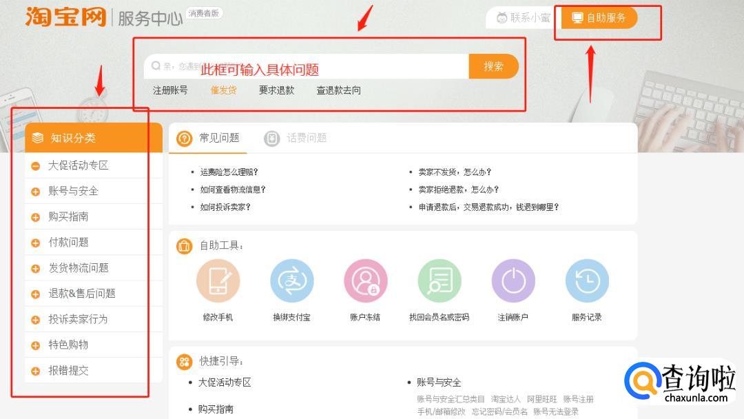 如果点击的是步骤4中的“自助服务”选项,将会打开下图窗口页面,在此窗口顶部可直接输入内容,同时在左侧会有相关的选项卡,按照各自的所需点击并查看内容即可。