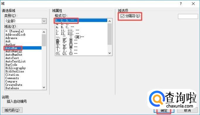 弹出的界面,我们点击选择AutoNum,然后我们点击选择1,2,3···,然后我们勾选上分隔符,之后点击确定;