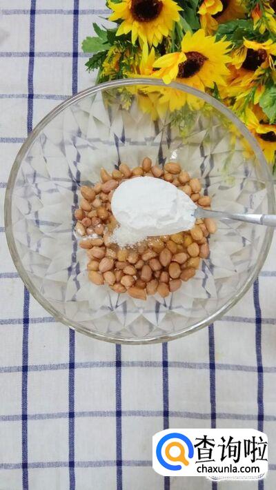 搅拌成如下图所示的样子,让每一个花生都均匀的裹上一层淀粉,一粒一粒尽量分开。