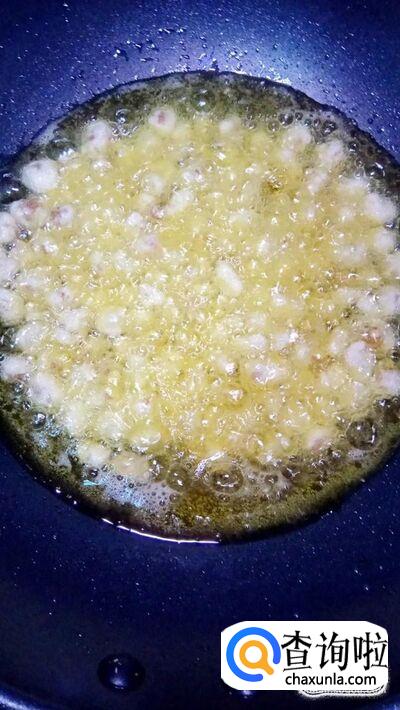 锅中放入适量油,油温五成热,将花生放入锅中,小火慢炸。