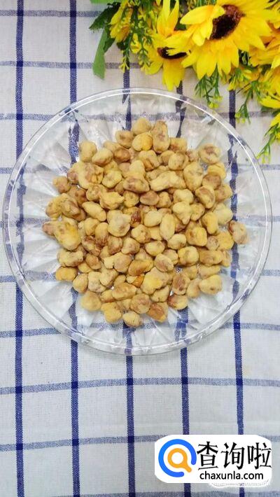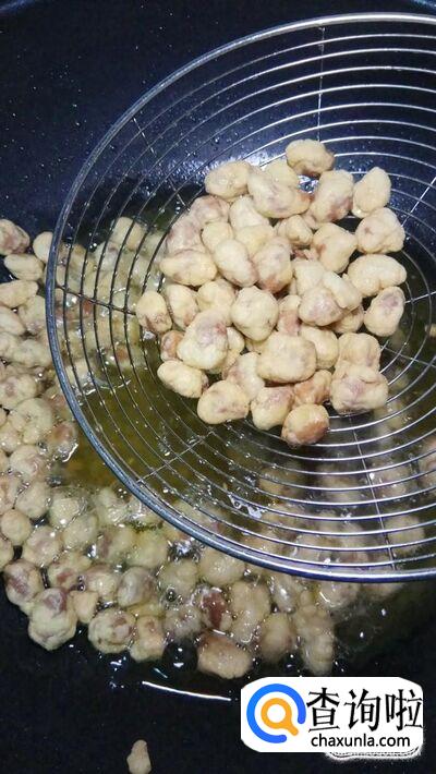 炸至外表金黄酥脆,捞出,沥干油。注意,油温不能太高,否则花生就糊了。