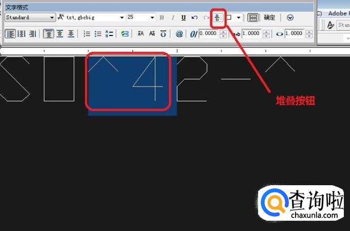 如图,选中“^4”和“2-^”,分别点击一下“文字格式”工具栏中的堆叠命令按钮,就可以看到上下标的效果了,其中^符号在前面的表示下标,^符号在后面的表示上标。