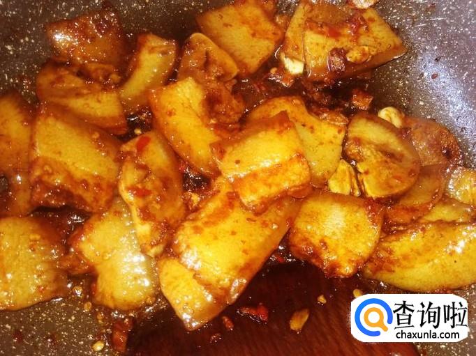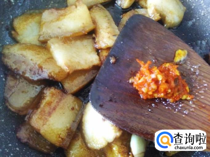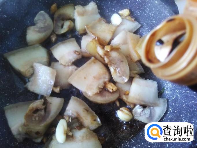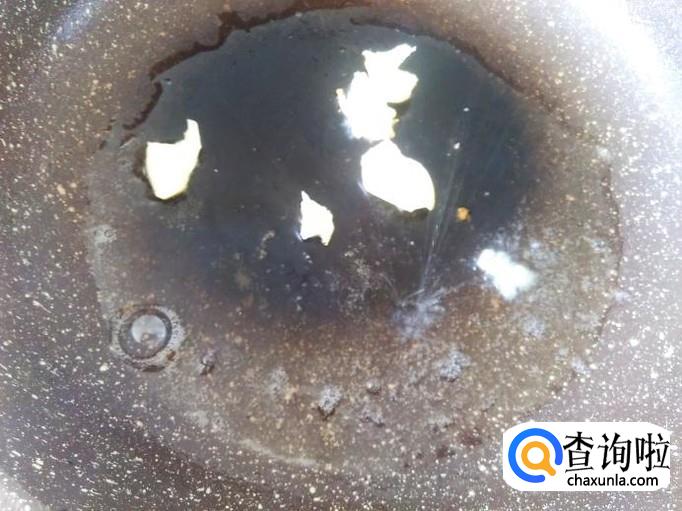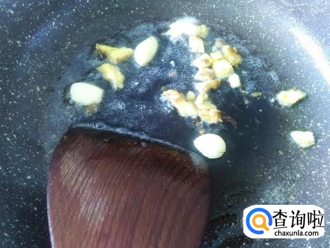再开火下油,放蒜米、姜蓉进去爆香,然后放猪头皮进去加适量的生抽。