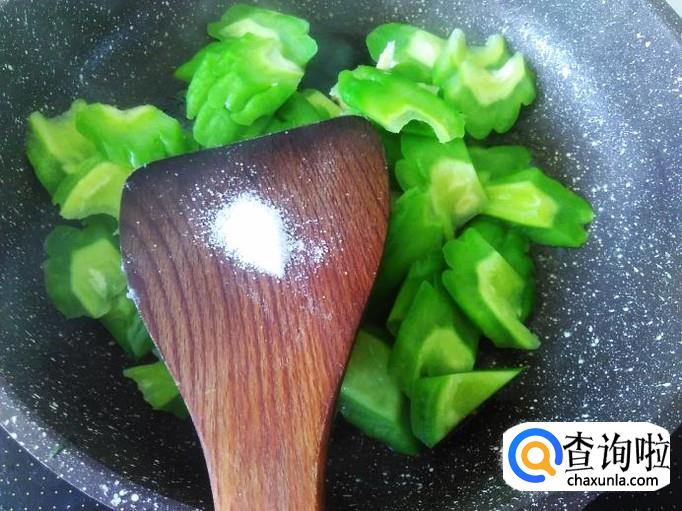 再开火下油,放蒜米进去爆出味来,苦瓜回锅加适量的盐。