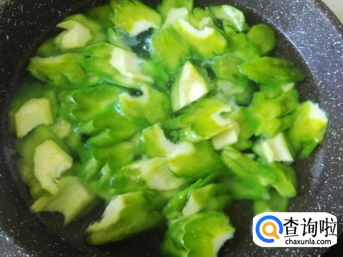锅装适量的水煮沸,然后放苦瓜进去灼20秒左右。