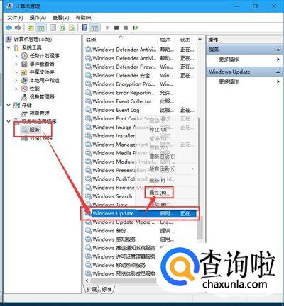 打开“计算机管理”窗口,单击“服务和应用程序”左侧的下拉按钮,在展开的列表中单击“服务”,在右侧找到“Windows Update”并右击,在弹出的快捷菜单中单击“属性”命令,如下图所示。