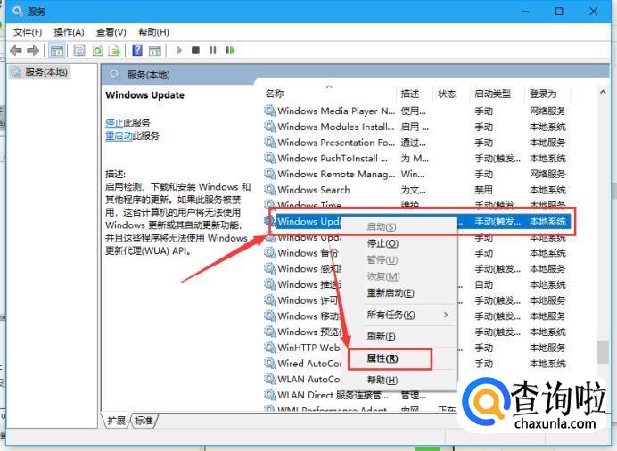 打开“服务”窗口,在右侧找到“Windows Update”并右击,在弹出的快捷菜单中单击“属性”命令,如下图所示。