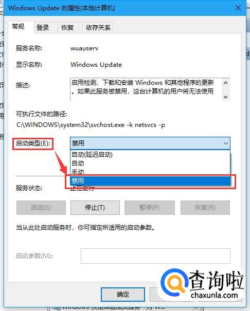 打开“Windows Update的属性(本地计算机)”对话框,在“常规”选项卡下设置“启用类型”为“禁用”选项,完成后单击“确定”按钮。如下图所示。