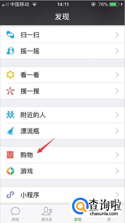 首先我们先在微信里的发现页面找到购物的入口并点击进入。