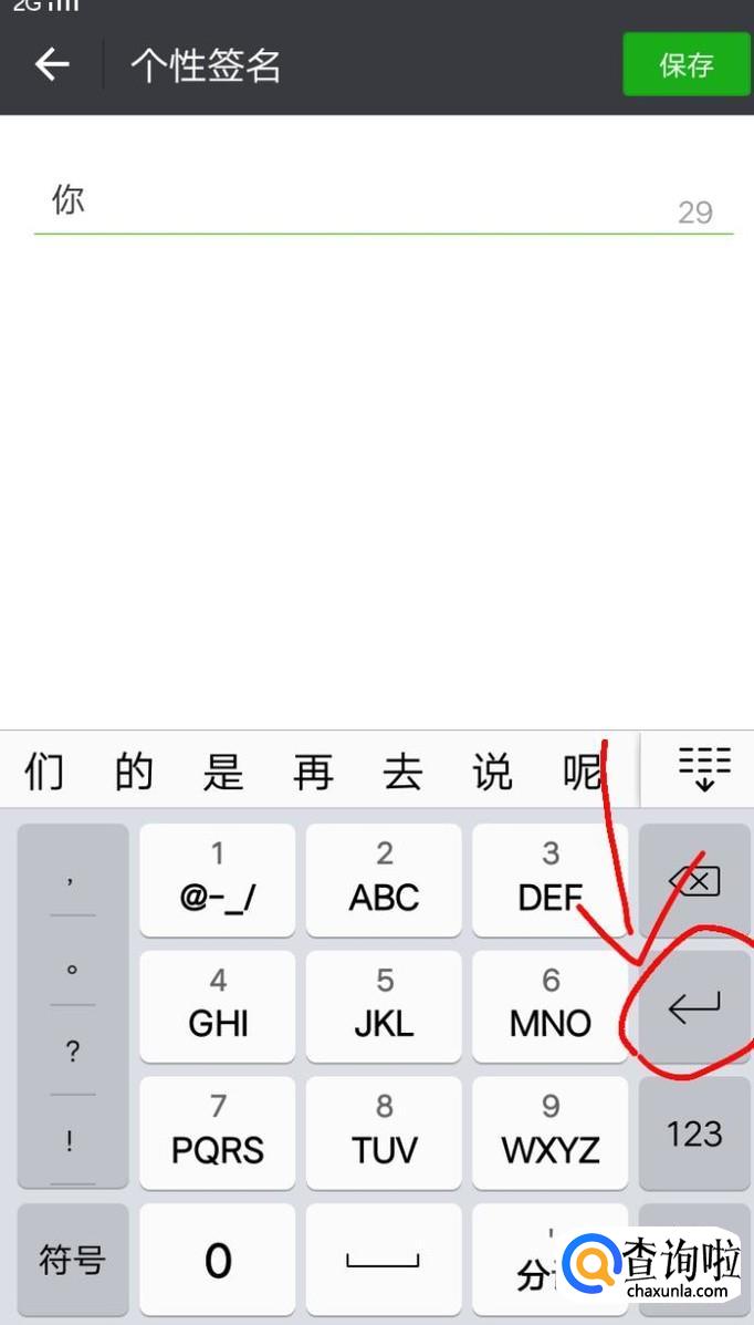 此时看到的是横着的个性签名,将其删除,然后输入一个字,点击下回车键,直到输入到最后一个字为止。最后点击保存即可
