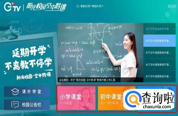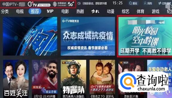 首先打开电话,找到G+TV推荐栏目“阳光校园空中黔课”,可以进入阳光校园空中黔课的专区。