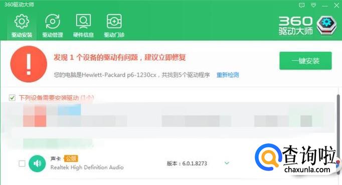 我们可以借助驱动软件来安装声卡驱动即可,比如360驱动大师,打开它后会自动检测未安装的驱动,我们点“一键安装”就会自动安装声卡驱动了。