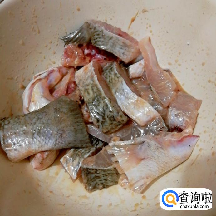 控干水后就切成片,(今天我切成块了,刀不太好了。)拿出酸菜鱼包里面的腌鱼包搅拌均匀腌制十分钟以上。