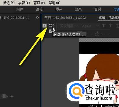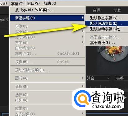 接着,鼠标移到菜单栏,点击“字幕”,再点“新建字幕”,再点:默认滚动字幕