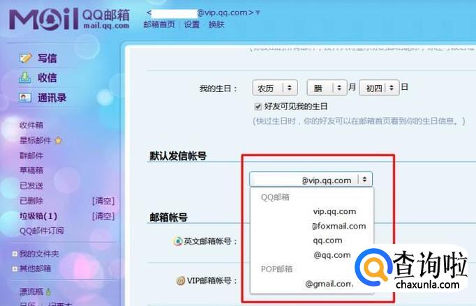 最后,在默认发信账号列表中,选择自己想显示的账号即可,需要注意的是,这些账号信息全都是自己的QQ邮箱账号,本质上都是一样的。