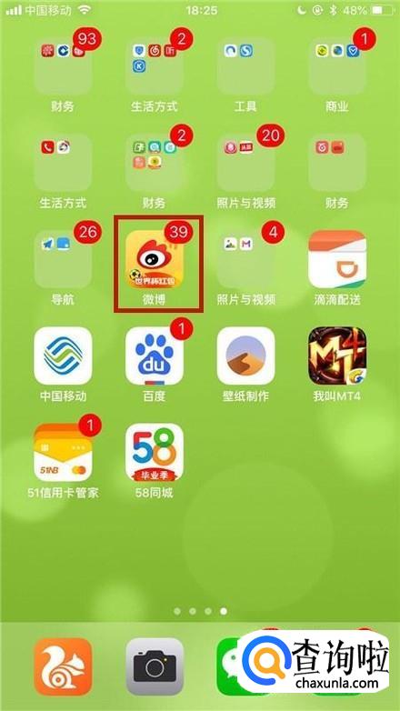 首先在我们的手机桌面上找到微博并点击它,如下图所示。