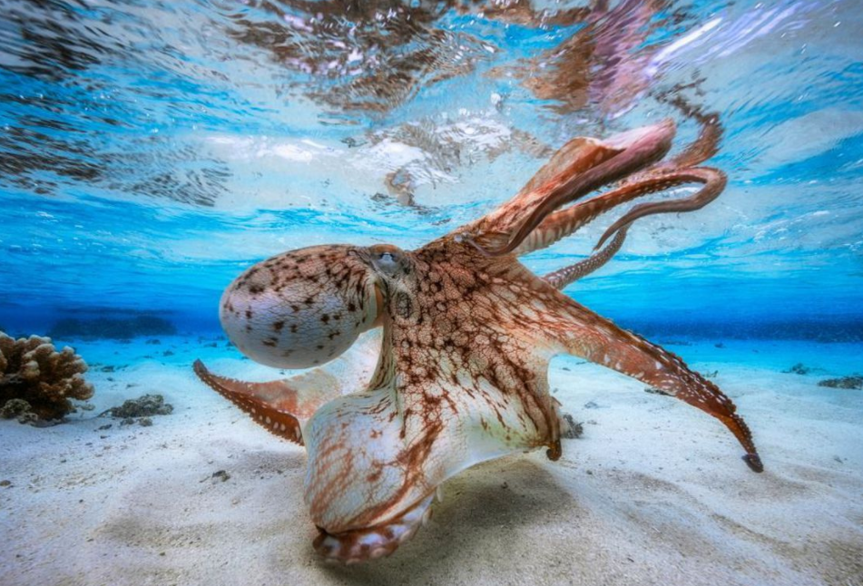 其实,章鱼的脑袋并不那么大,我们所看到的脑袋大部分是躯体,科学家解剖以后发现,里面藏着全部内脏,包括鳃、胃、肝、肾及墨囊等器官。章鱼的头长在眼睛后面的身体里,我们看不见,才误以为它的躯体就是脑袋。