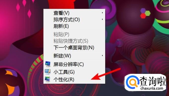 右键点击桌面上的空白地方,在菜单上点击‘个性化’