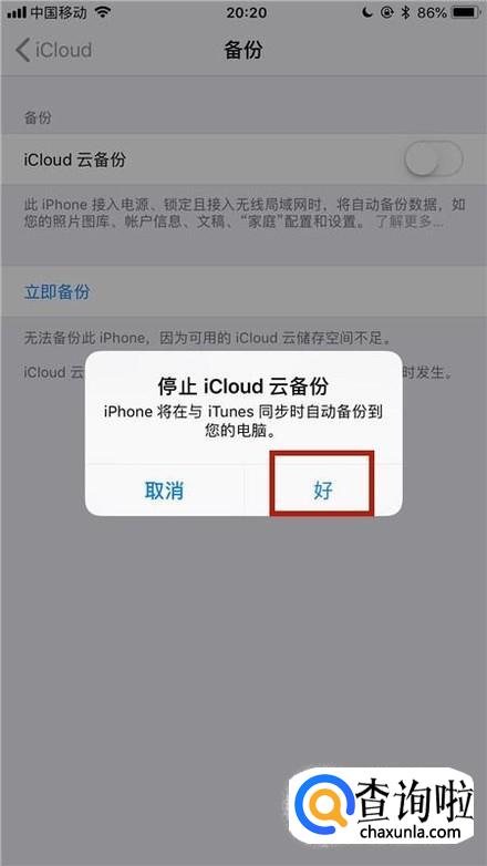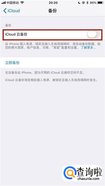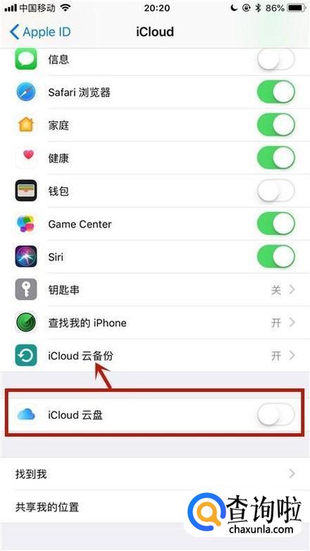 然后点击关闭iCloud云盘并点击iCloud云备份,如下图所示。