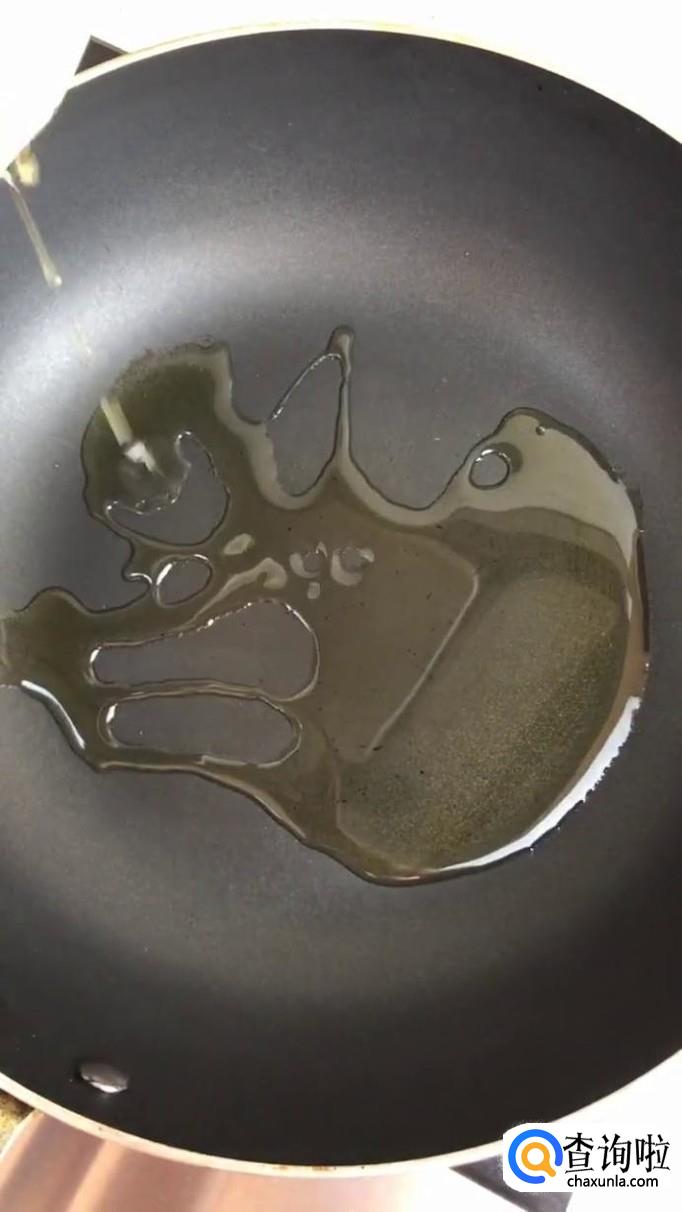 接着在平底锅中加入适量的食用油,把油烧热,如下图所示。