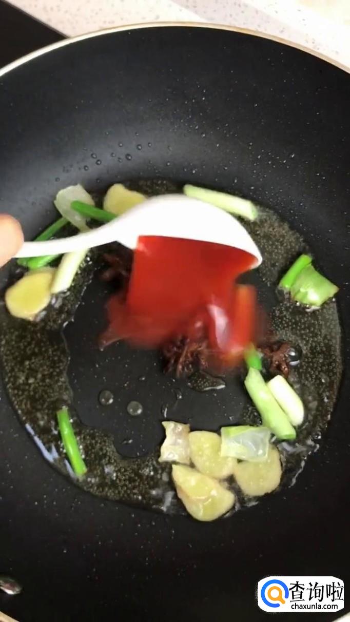 然后往加入蒜头,大葱和八角爆香,如下图所示。
