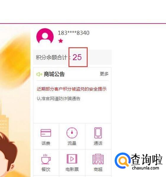 接下来,在打开的中国移动积分商城页面中使用手机账号登录,登陆成功之后点击自己当前的积分余额。