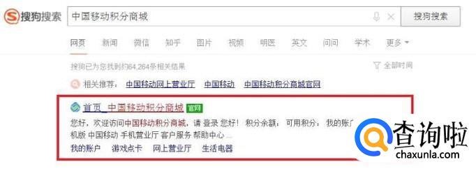 打开搜索引擎搜索“中国移动积分商城”关键字,在搜索结果页面中点击打开该网站。