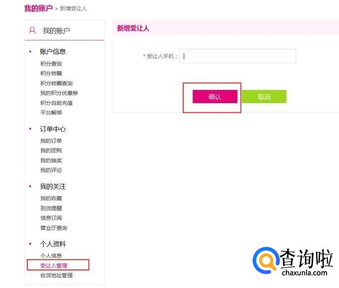 接下来,将打开个人中心账户页面,点击页面左侧“受让人管理”菜单,然后添加转让方的手机号码。