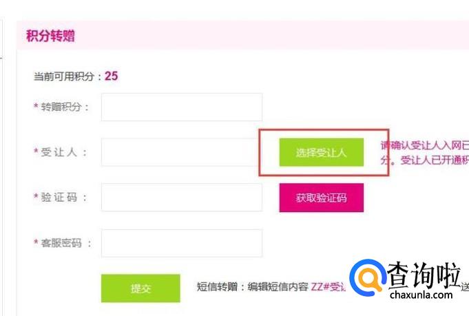 最后,我们输入手机验证码和服务密码,点击“提交”按钮,这样积分就成功转让了。