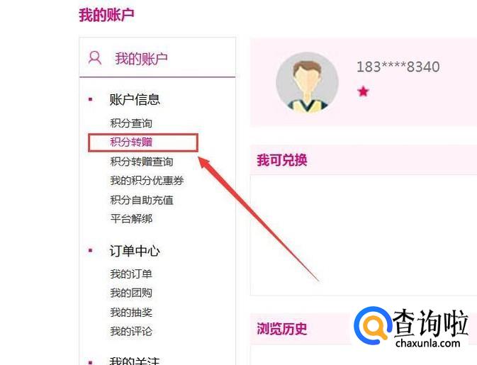 受让人添加完毕之后,点击页面左侧“积分转赠”菜单按钮,点击打开之后即可看到积分转赠信息页面。