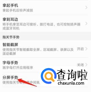 在“手势控制”菜单中点击“分屏手势”,然后开启“分屏手势”。