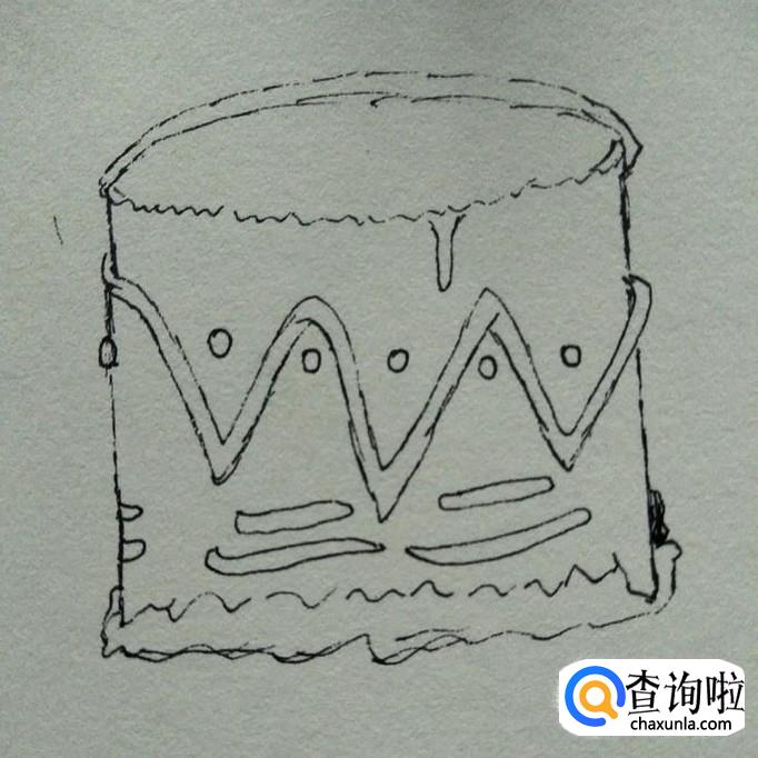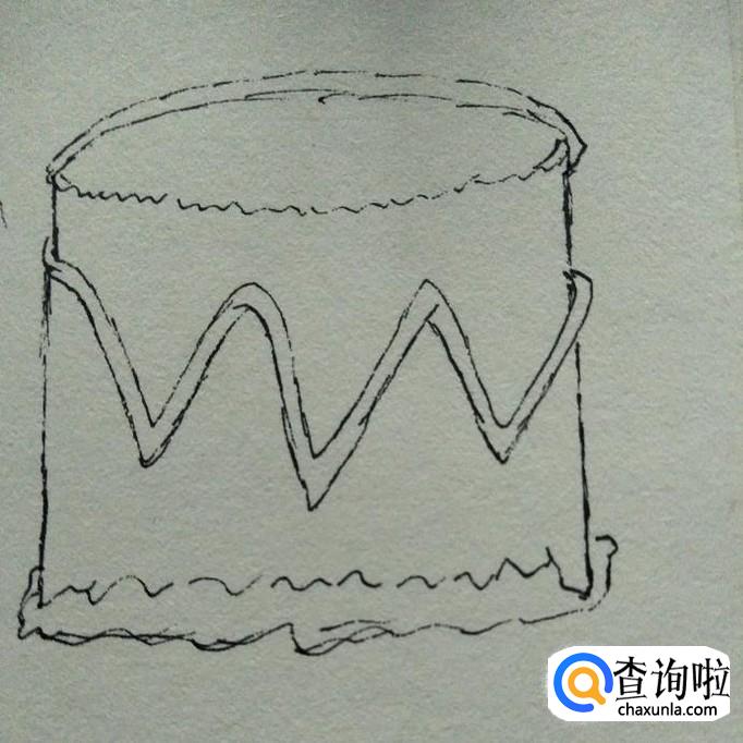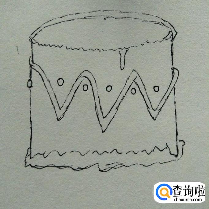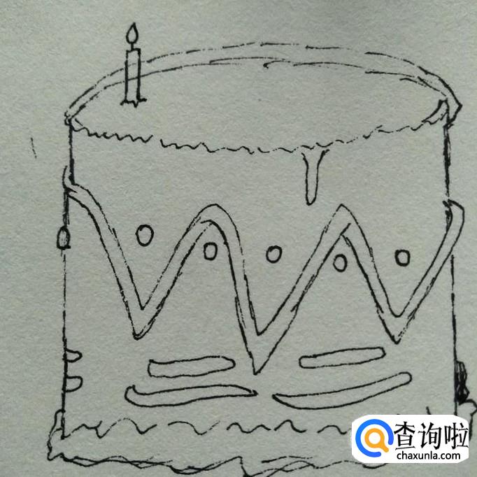然后,在下端夹角处分别画出一些条状,如下图,这时,我们蛋糕基本样子就画好了