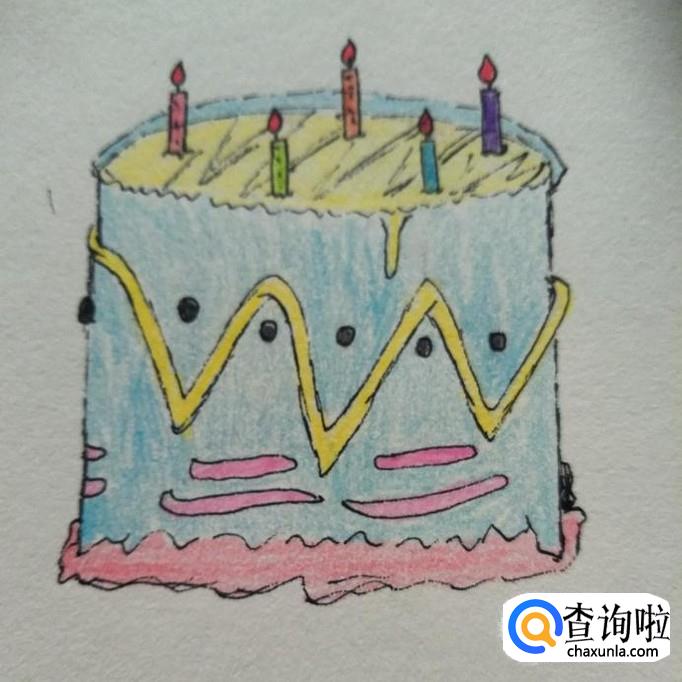 最后,我们用蜡笔、彩铅或者水彩笔将蛋糕涂一下颜色,小编自己涂好色后的成品如下图所示,大家可以根据自己的喜好涂色,同时还可以在蛋糕上面画出一些水果并且图上相应的颜色,建议大家如果用彩铅涂色的话最好用水溶性彩铅,这样涂色更均匀,看起来更棒。