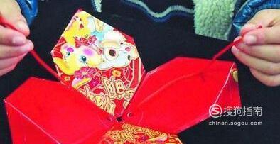 拿出其中两个红包,在顶部用打孔器各打一个孔。将打好孔的红包与另两个红包拼成十字形,并用订书机把四个角钉牢。