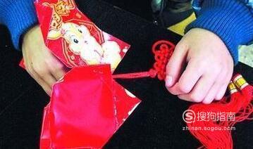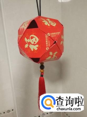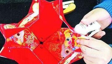 再用四个红包,沿着折角钉成一圈,做出灯笼的上半部。